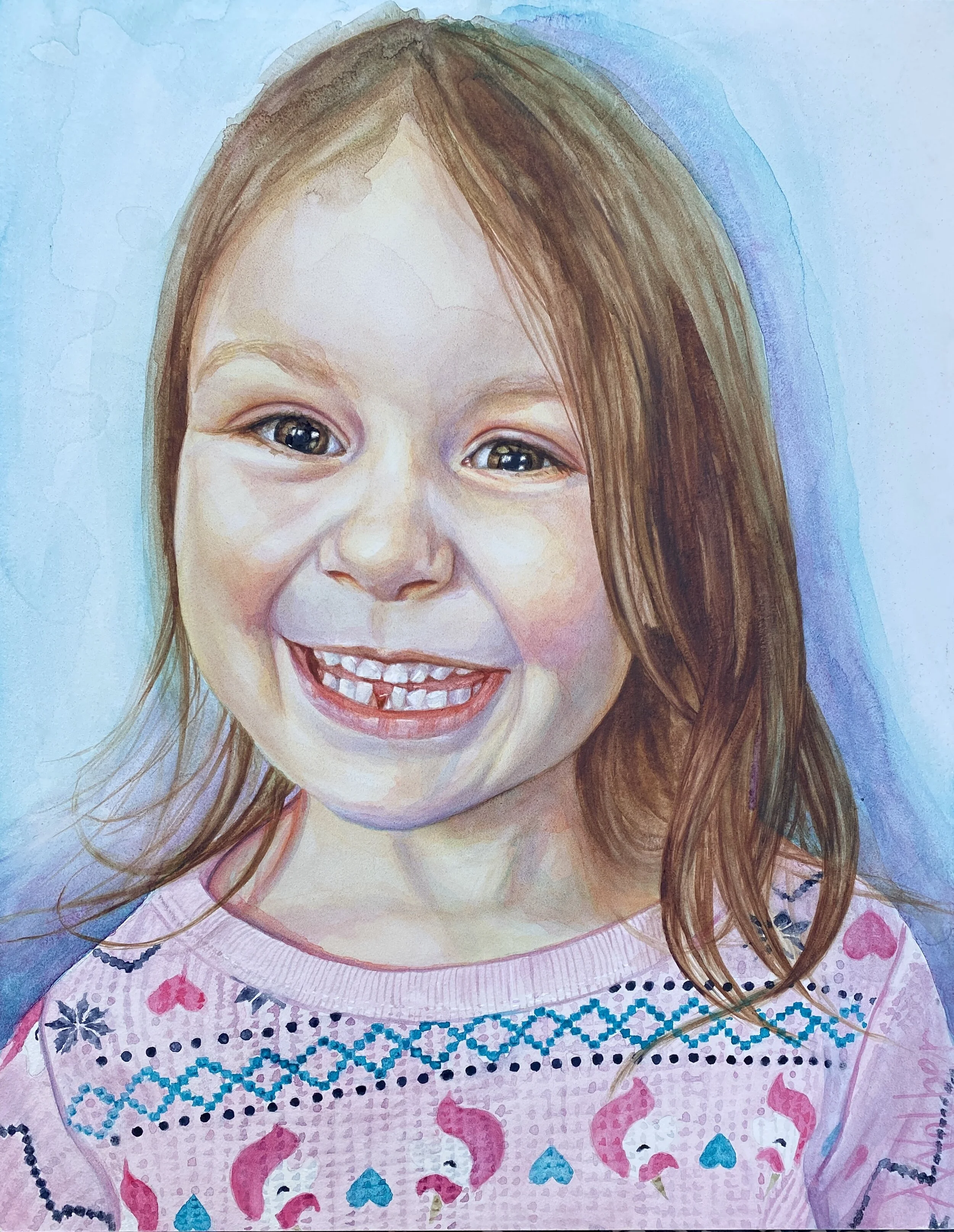 Commissioned portraits are a unique way to add an heirloom to your family. Your portrait will be painted on a museum grade watercolor Aquaboard, with a 1.5” deep wooden cradle (side profile) and protected with an archival varnish. This varnish allows the painting to be hung as-is without the protection of glass. Portraits typically take 2 months to complete, but if you have a specific date needed, I will certainly see what I can do to accommodate it. Below is an outline of the commissioning process.